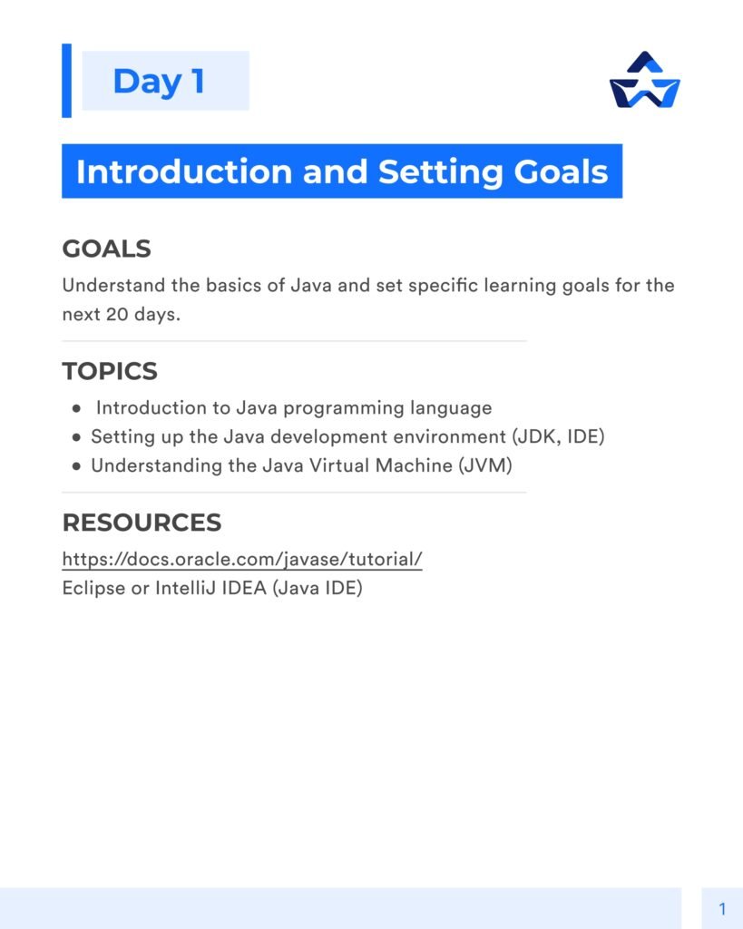 The “Become JAVA Expert in Just 20 Days” PDF is a comprehensive training guide that outlines a clear and concise roadmap for learning Java. This document is organized into 20 days of focused learning, with each day dedicated to specific topics essential for mastering Java programming. The structure allows learners to set achievable goals, practice skills, and progressively build upon their knowledge.