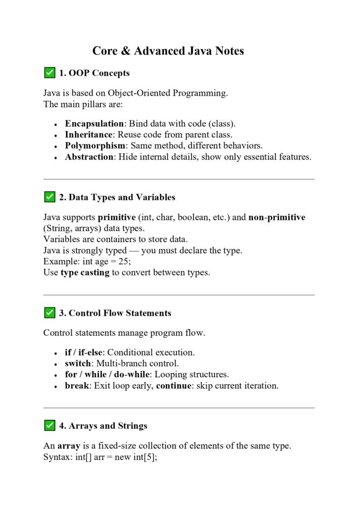 The Core & Advanced Java Notes PDF is designed for learners who want structured and concise study material. It begins with the fundamental principles of Java programming, such as Object-Oriented Programming (OOP) concepts, data types, variables, arrays, and strings. From there, it gradually advances to cover complex topics like multithreading, the Java Collections Framework, Java 8+ features, memory management, and database connectivity with JDBC.