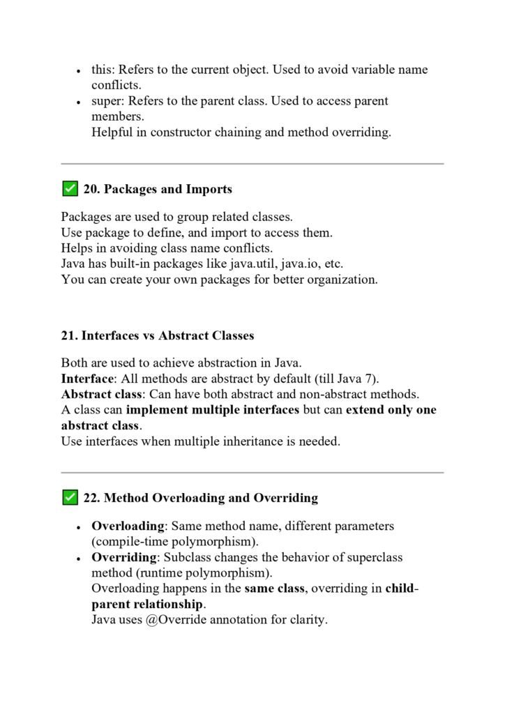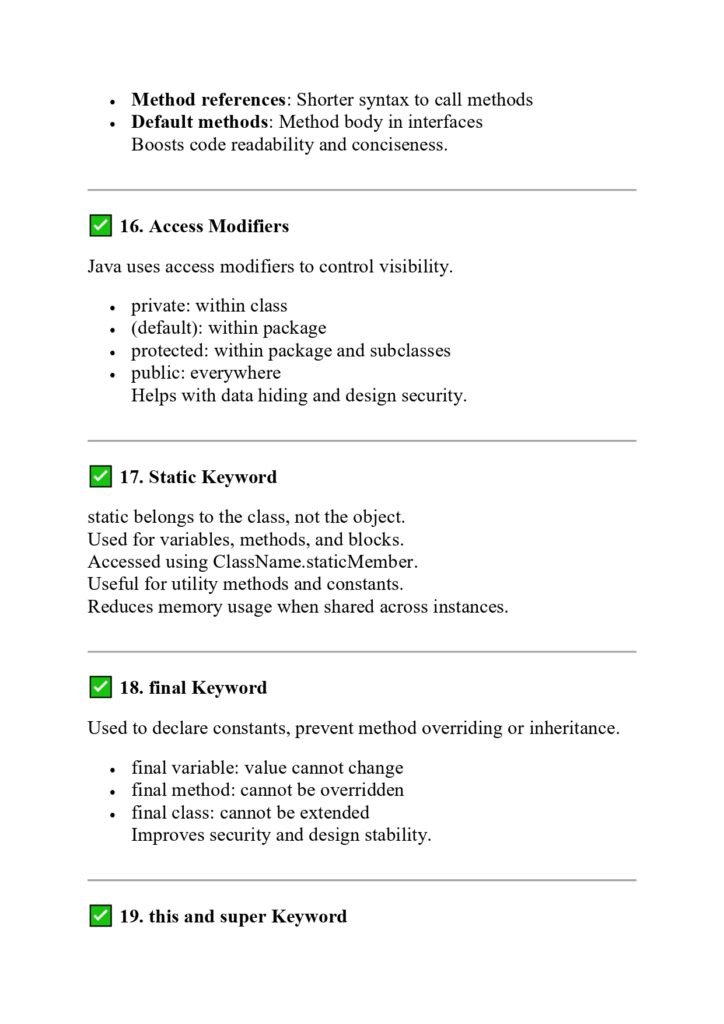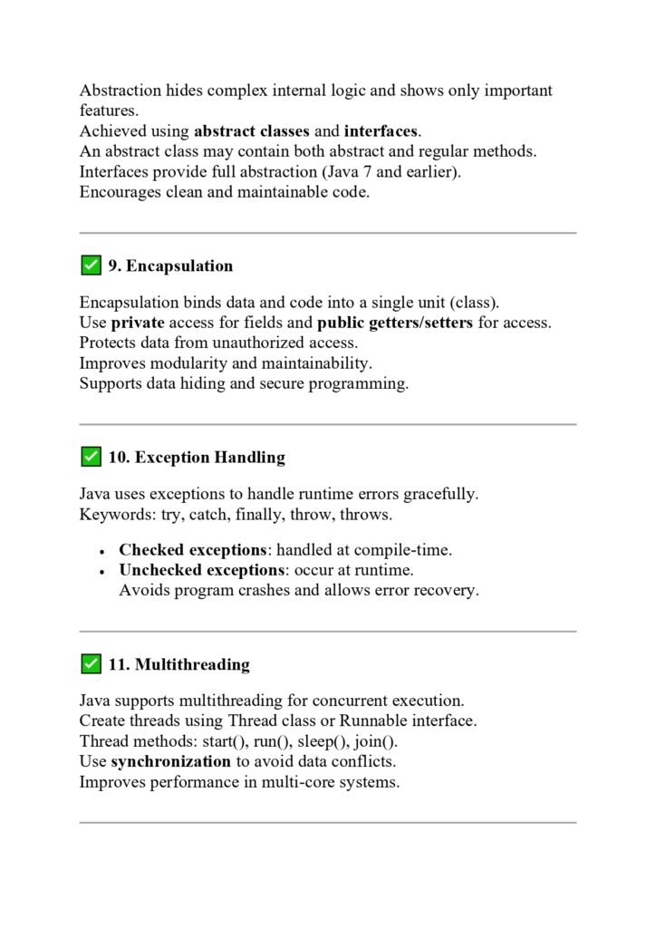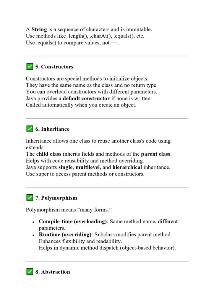 - Core Java Topics: OOP principles (Encapsulation, Inheritance, Polymorphism, Abstraction), constructors, exception handling, control statements, arrays, strings, and access modifiers.