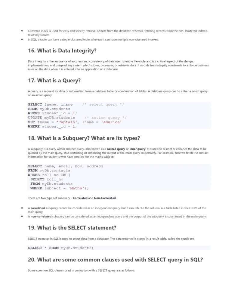 - Data Integrity and Constraints: Questions on enforcing data integrity through primary keys, foreign keys, unique constraints, and check constraints.