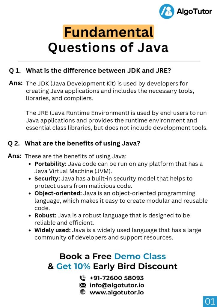 - Fundamentals of Java – Basics like JDK vs JRE, data types, control statements, exceptions, and libraries.
