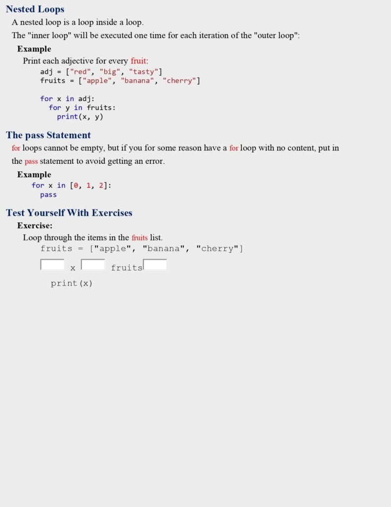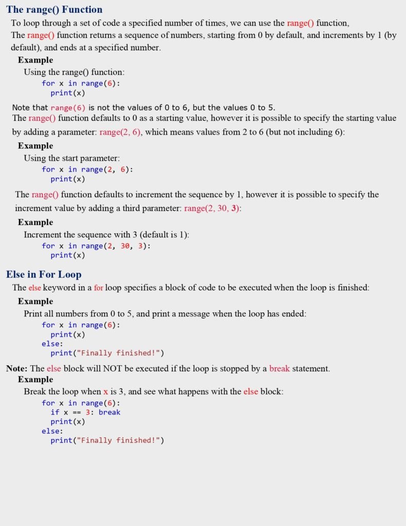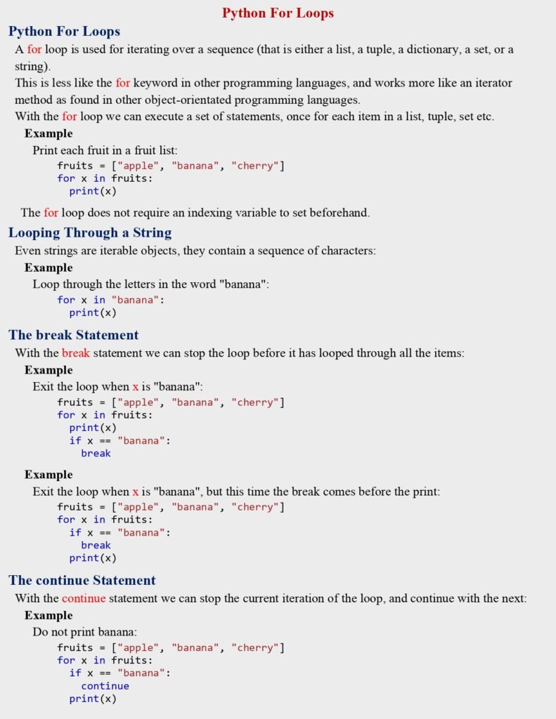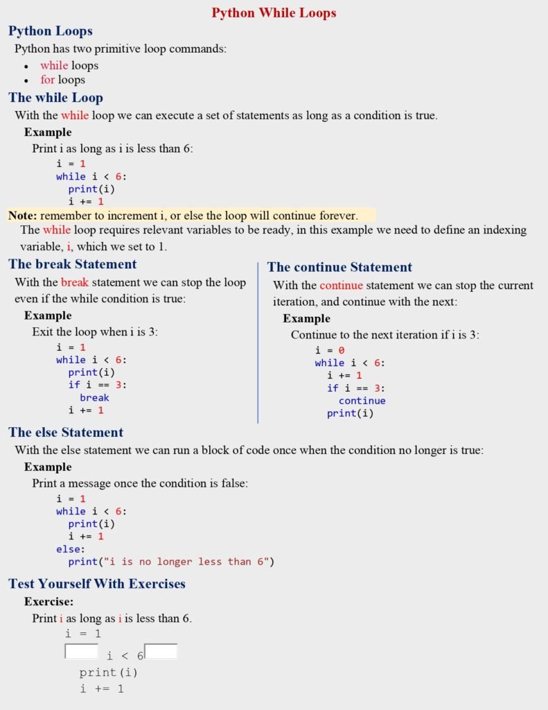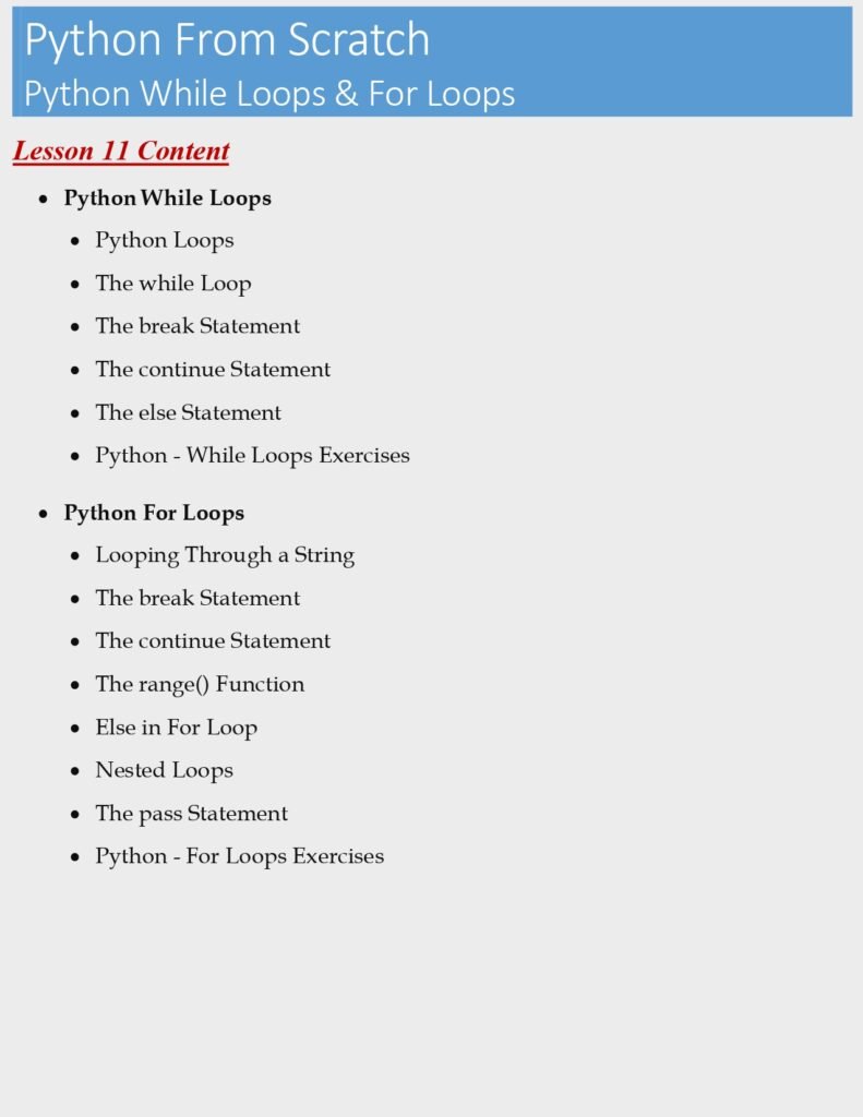 Python While Loops & For Loops Four pages of summary in PDF format to start learning the Python language with a series of lessons that we will complete together to master the Python language