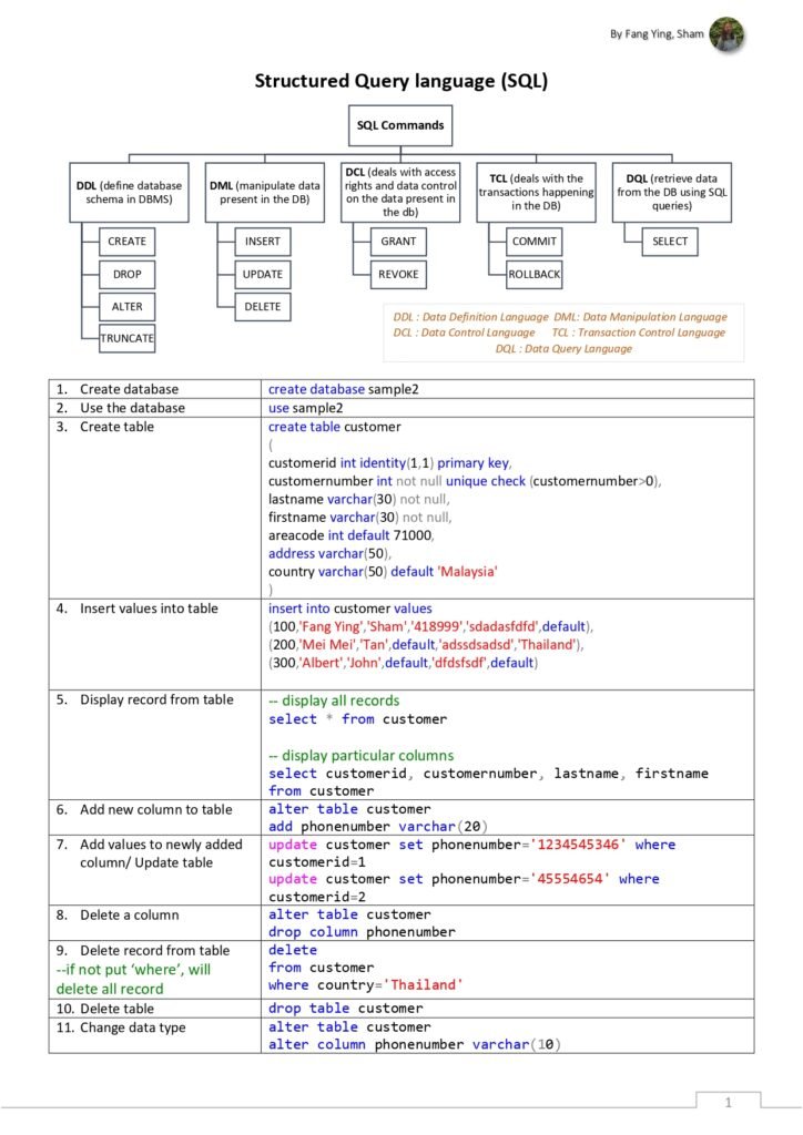 - Data Manipulation Language (DML) Commands: Commonly used DML commands such as SELECT, INSERT, UPDATE, and DELETE, along with their syntax and usage examples.