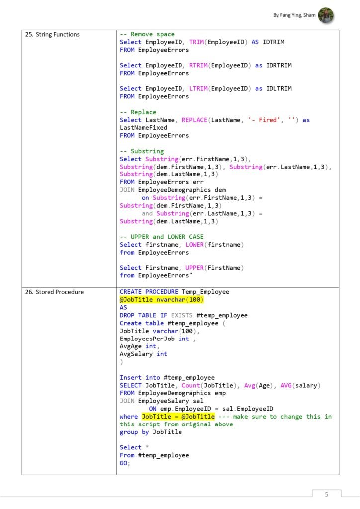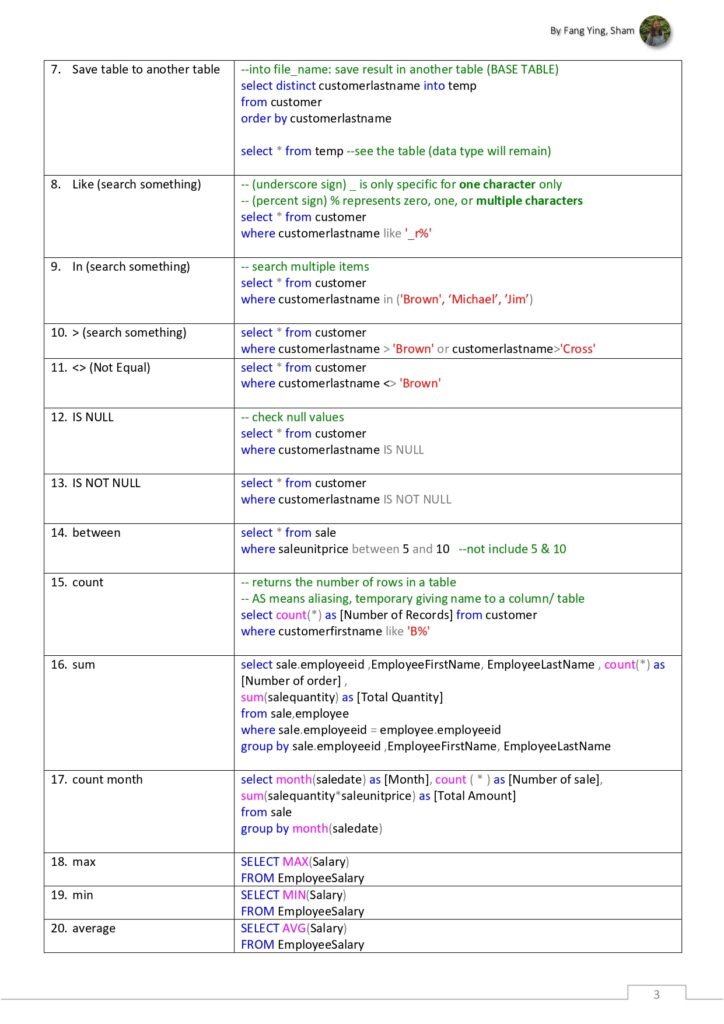 - Aggregate Functions: A list of aggregate functions such as SUM, AVG, COUNT, MIN, and MAX, along with their usage in calculating summary statistics.
