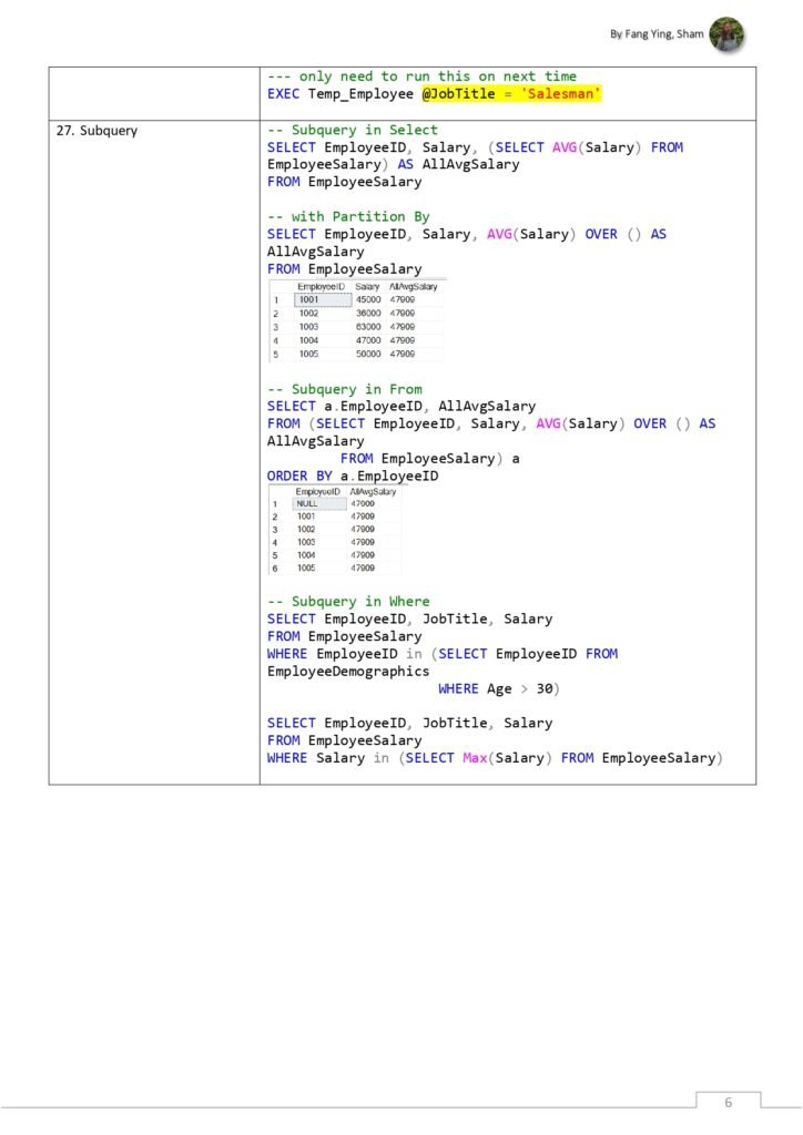 - Subqueries: Examples and syntax for incorporating subqueries in SQL queries to retrieve data from nested or dependent tables.