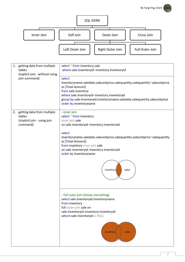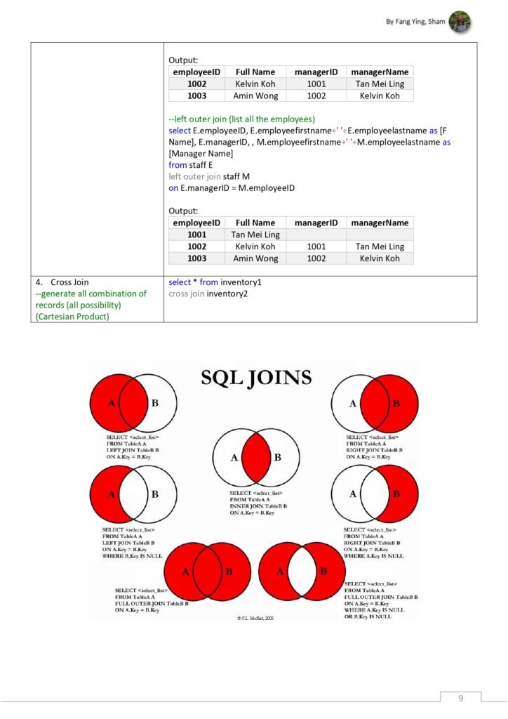 - Joins: An overview of different types of table joins, including INNER JOIN, LEFT JOIN, RIGHT JOIN, and CROSS JOIN, with code snippets for each.