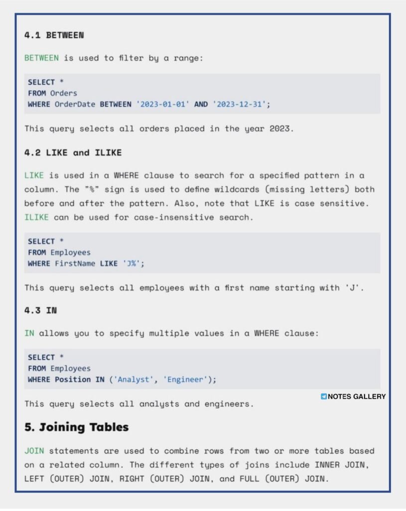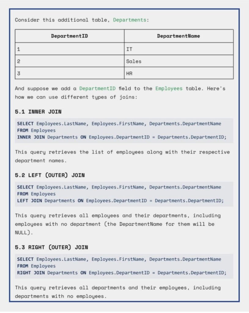 - Joins and Relationships: Understand the concept of table relationships, learn different types of joins (e.g., INNER JOIN, LEFT JOIN, RIGHT JOIN), and discover how to combine data from multiple tables effectively.
