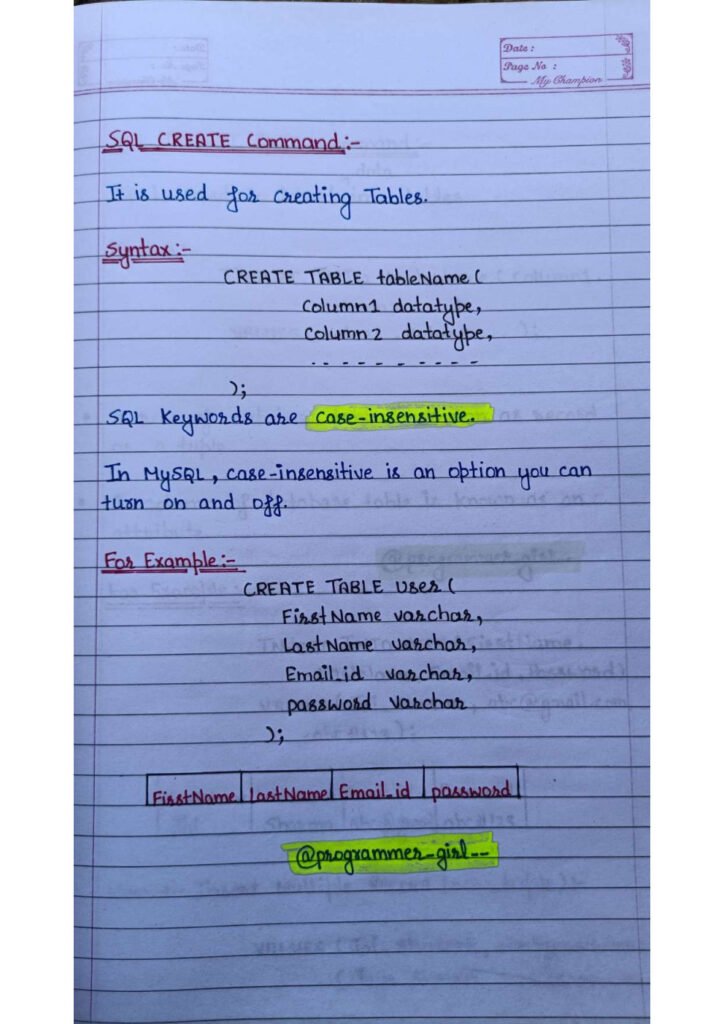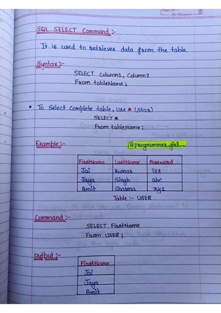 The handwritten format adds a layer of authenticity and personalization to the learning experience. Annotations and emphasis on key points serve as signposts, directing learners towards crucial information and insights. The goal is to make the SQL learning journey more engaging and memorable.