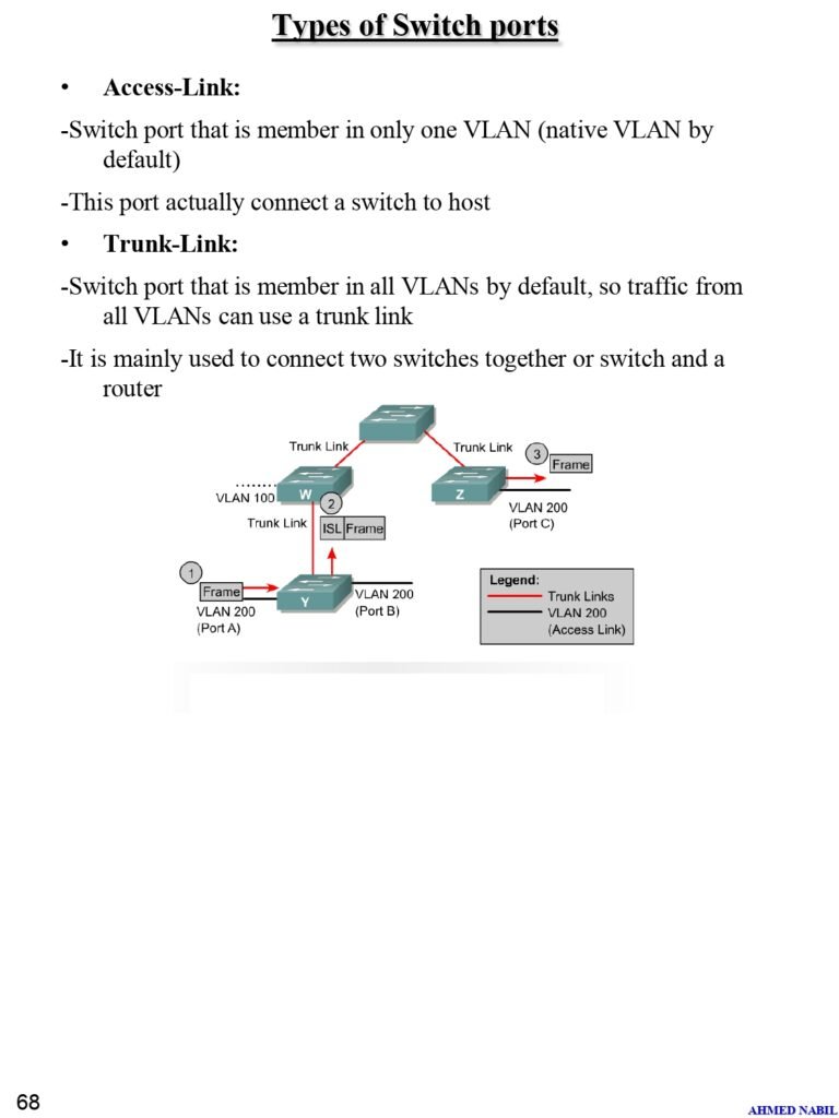 - Port Types: Access vs. Trunk links.