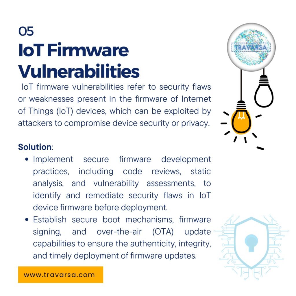 - Mitigation: Change default passwords, segment IoT networks, use firmware signing.