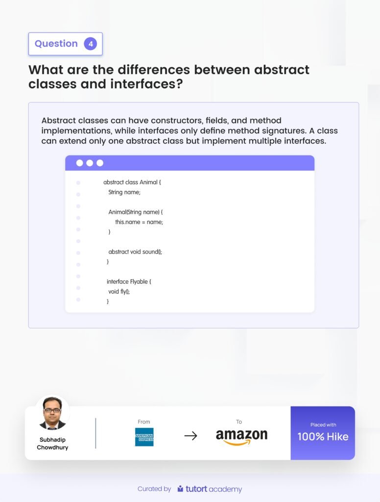 The advanced section covers the more complex Java topics that are often asked in interviews, such as generics, collections, concurrency, streams, lambda expressions, functional interfaces, design patterns, and JVM internals. Each question is followed by a detailed answer with code examples and explanations.